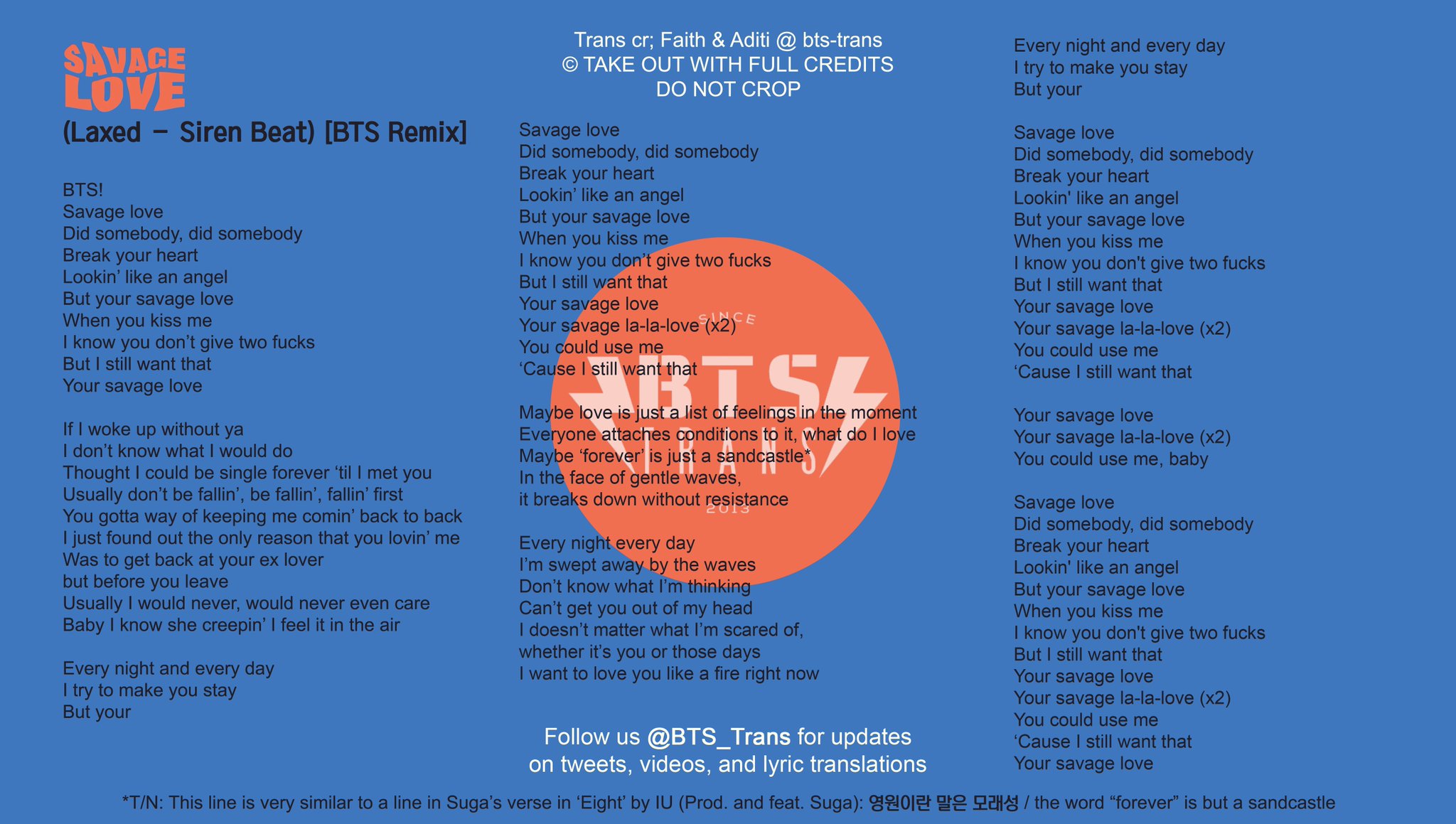 Bangtan Translations On Twitter Kor Eng Lyrics Savage Love Bts Remix Bts Twt Bts 방탄소년단 Savageloveremix Btsxsavagelove Https T Co 4qjbernfam Https T Co Gh7ibhnuey